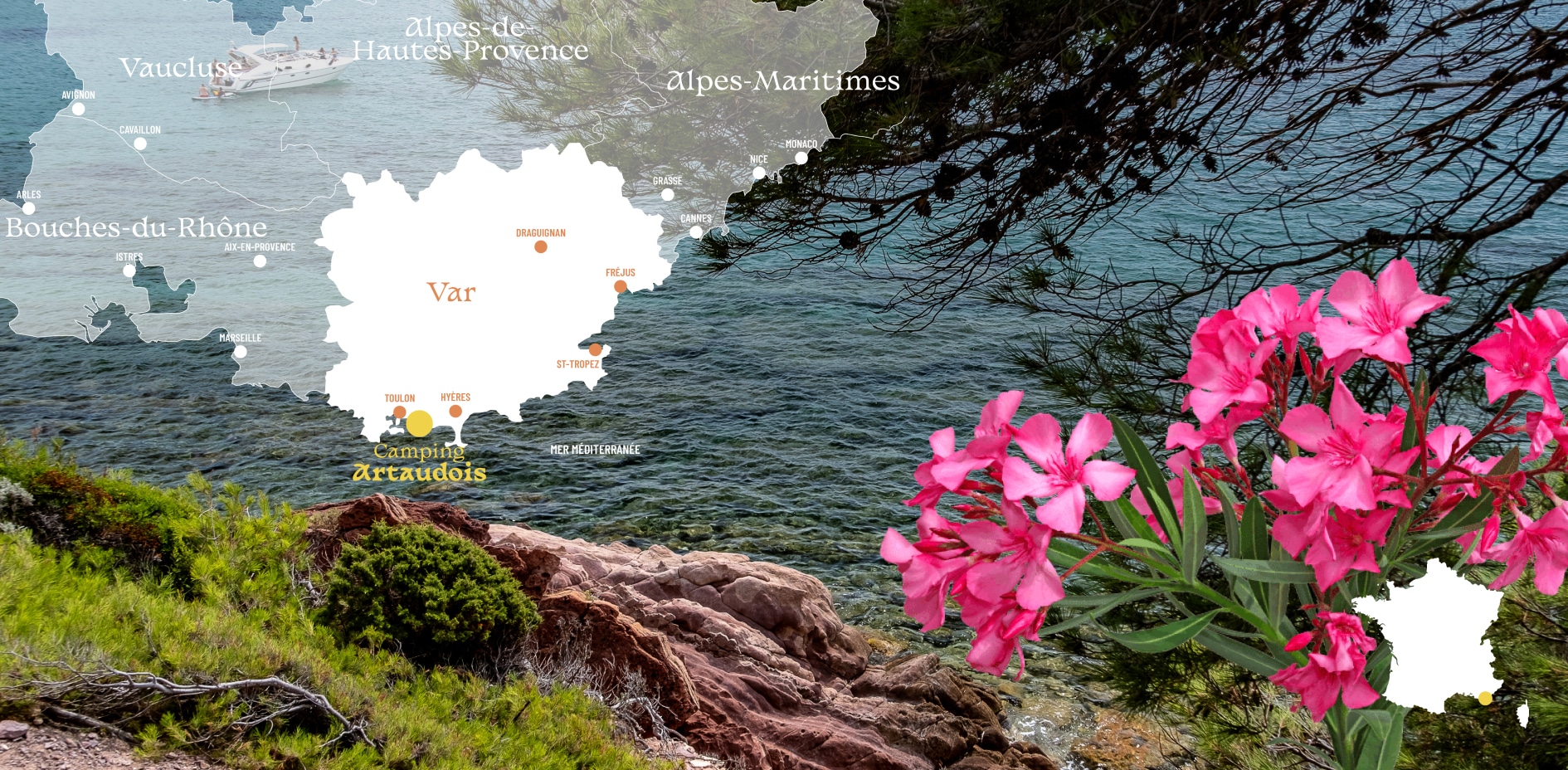 Bienvenue au Camping L’Artaudois 4 étoiles, notre camping est situé au Pradet entre Toulon et Hyères sur la Côte d’Azur. Installé sur un emplacement camping ou hébergé en location de mobil-home, profitez d’un cadre serein sur un grand terrain ombragé dans une pinède tout en restanques où se mélangent les senteurs de lavande et d’eucalyptus, à deux pas du bord de mer et de la plage de la Garonne.